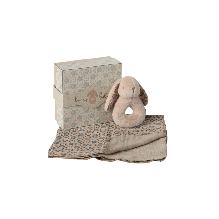 A perfect gift idea for the little ones. The set includes a soft cotton cloth and a small bunny rattle. The bunny has a small rattle inside that makes a soft sound. It all comes in a beautiful gift box.